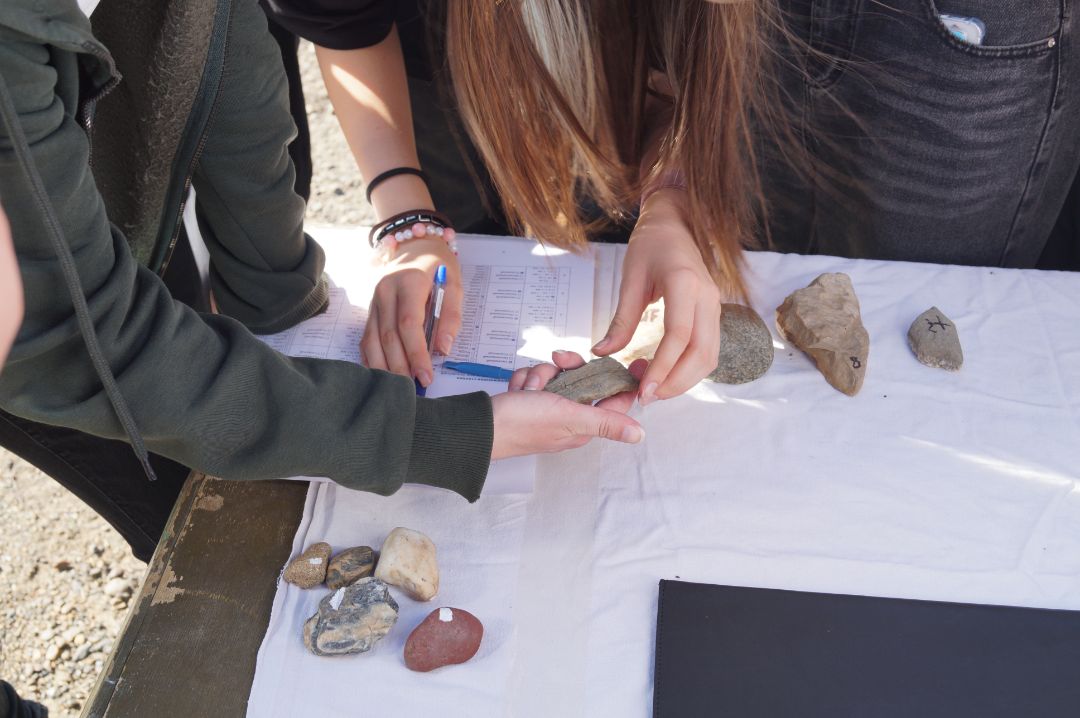 На станции «Геологическая» школьники изучали образцы горных пород, представленных в аллювиальных отложениях р. Томь. Узнали, как по степени окатанности можно определить удаленность источника размыва горной породы.